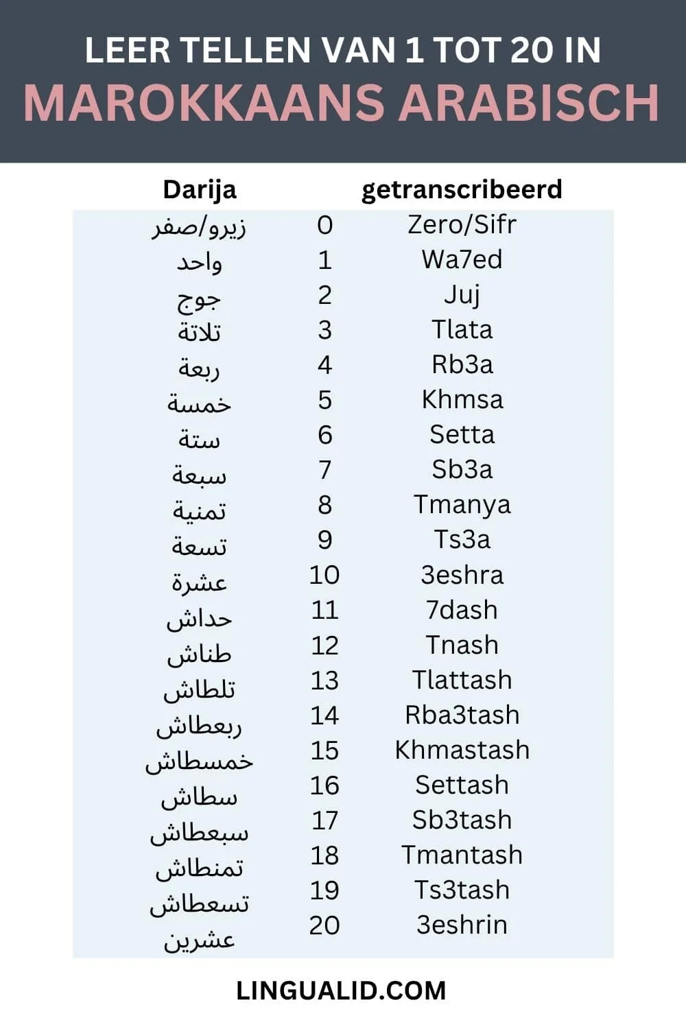 | Getal | Getranscribeerd Marokkaans Arabisch | In Arabisch Alfabet |